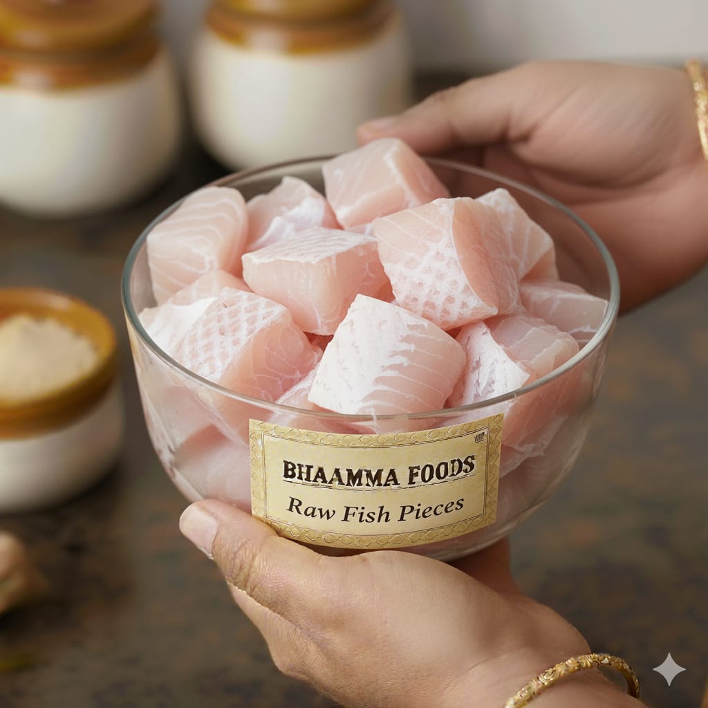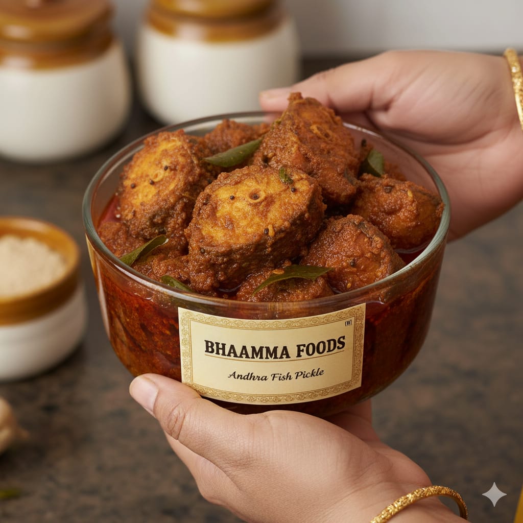 Home-Made Andhra Fish Pickle — a cherished seafood delicacy made with fresh, hand-cleaned fish, traditional Telugu spices and all blended and cured using time-tested home methods.